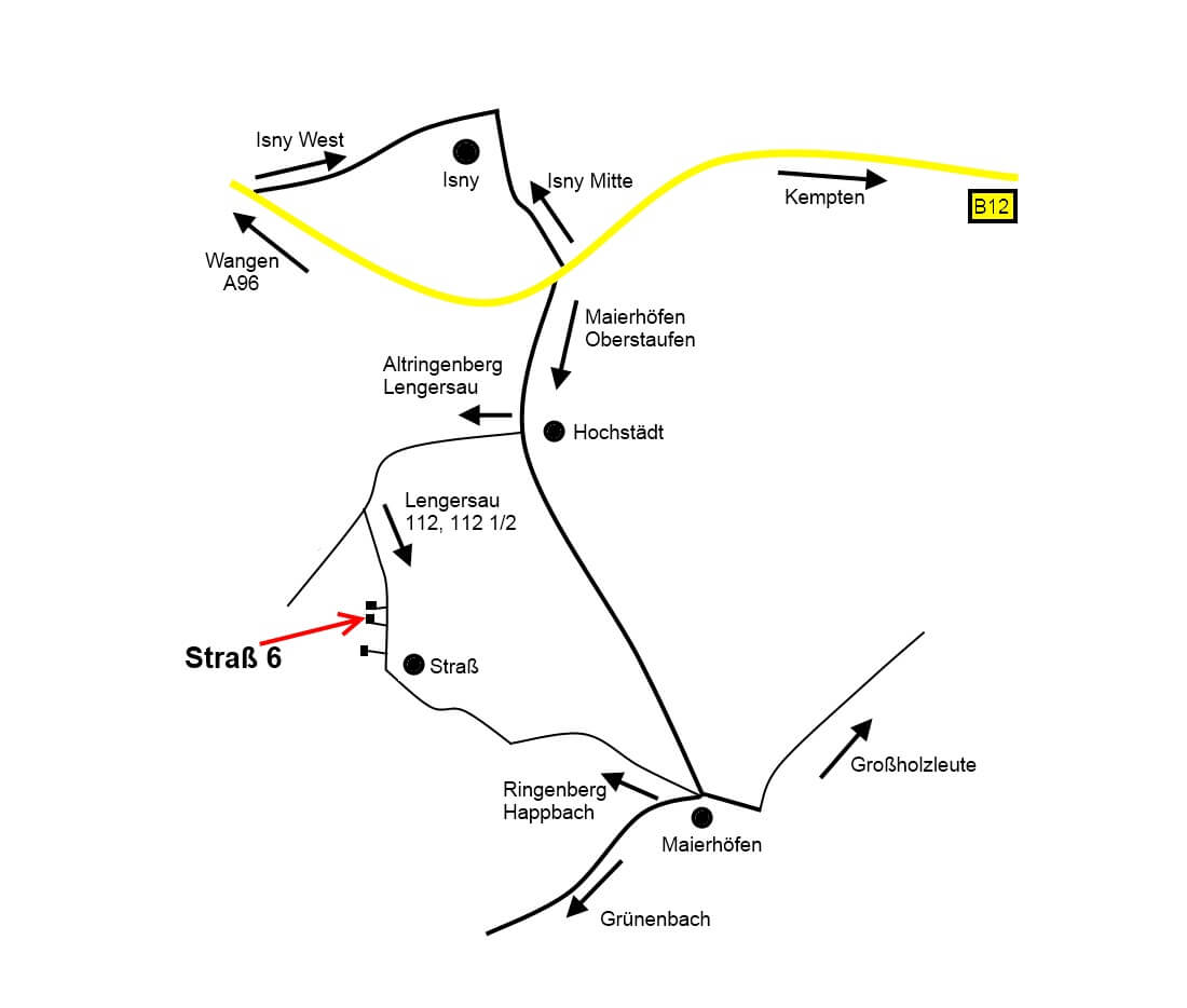 - Kommend von der B12 biegen Sie gegenüber der Abfahrt: „Isny Mitte/Historische Altstadt“ ab in Richtung Maierhöfen / Oberstaufen.